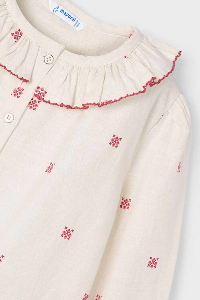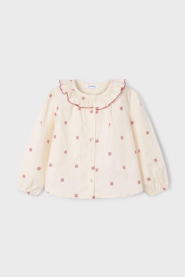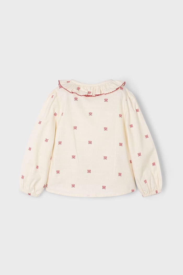 Romantik ve zarif bir tasarıma sahip olan bu bluz, çocukların gardırobuna nostaljik bir dokunuş katıyor. Nefes alabilen %100 pamuklu kumaşı, gün boyu konfor sunar. Bluzun en dikkat çekici özelliği, kenarları kontrast renk işlemelerle süslenmiş geniş fırfırlı yakasıdır. Üzerindeki minik desenler ve manşetleri lastikli kolları, tasarıma sevimli bir bütünlük kazandırır. Özel günlerde eteklerle veya günlük şıklık için pantolonlarla kombinlemek için mükemmel bir parçadır.