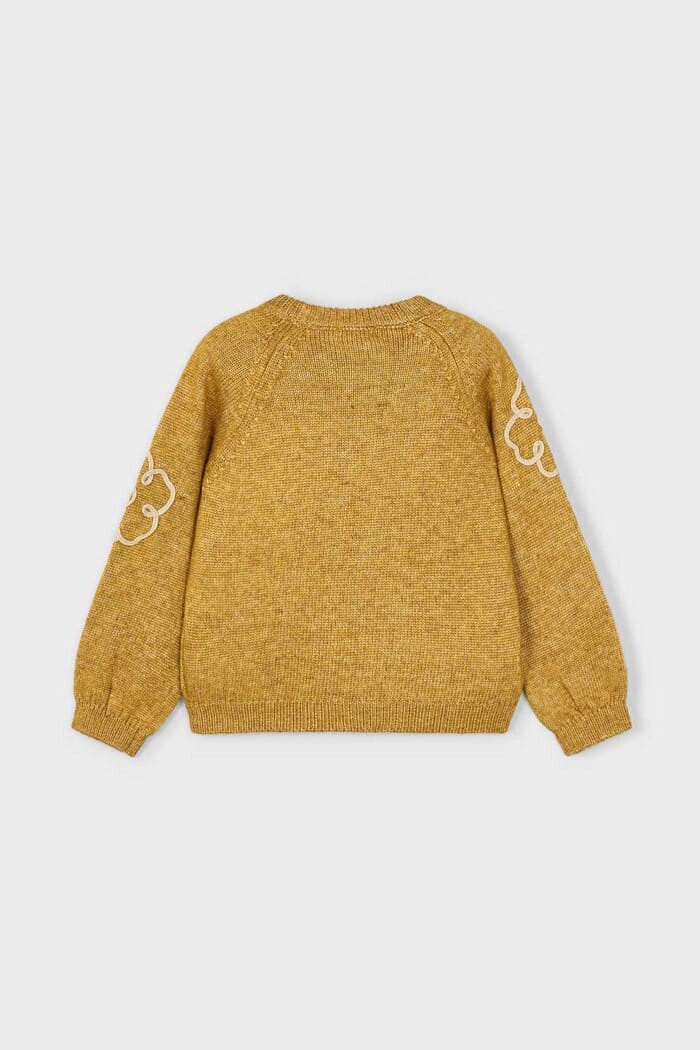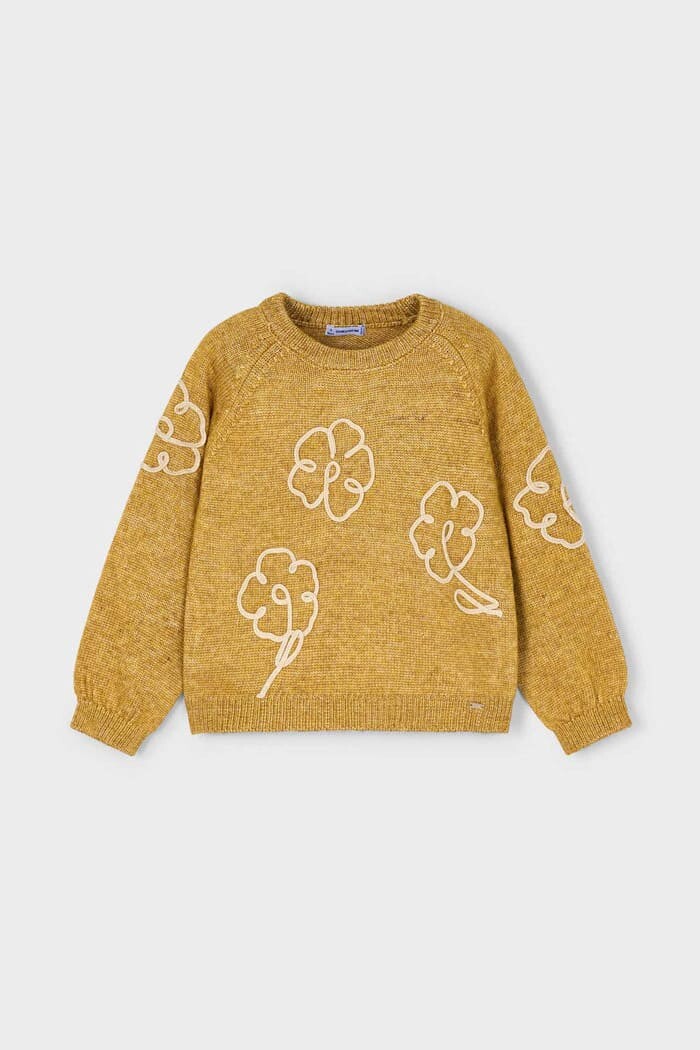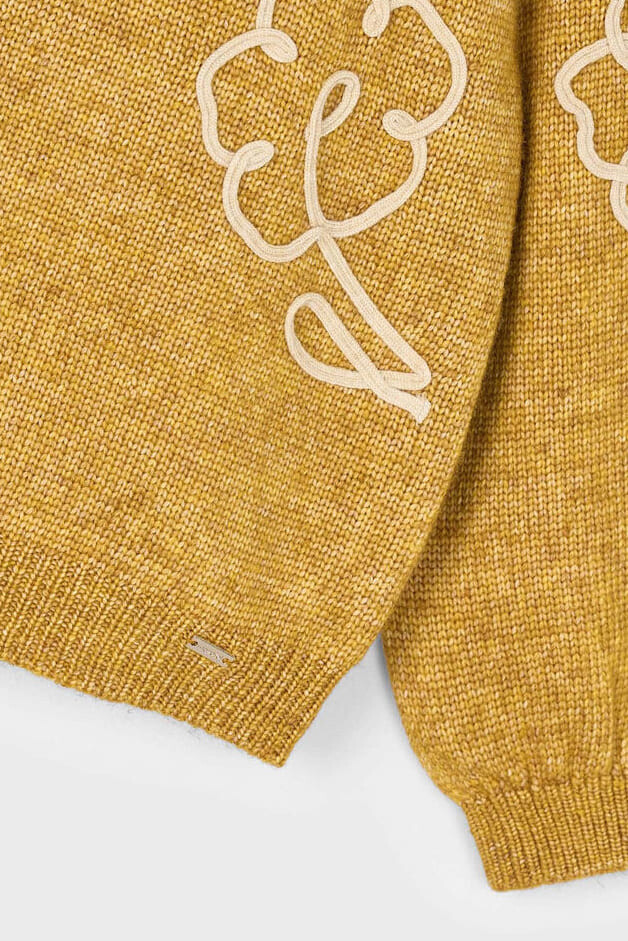 Soğuk günlere neşeli bir dokunuş katacak bu triko kazak, sanatsal tasarımı ve konforu bir araya getiriyor. Yumuşak melanj dokulu triko kumaşı sıcak tutarken, rahat kalıbı ve reglan kolları gün boyu hareket özgürlüğü sunar. Kazağın en dikkat çekici özelliği olan ön ve kol kısımlarındaki büyük, dokulu çiçek aplikeleri, tasarıma eğlenceli ve modern bir hava katar. Kot pantolonlardan eteklere kadar birçok parçayla kolayca uyum sağlayan bu kazak, çocukların kış gardırobunun favorisi olacak.
