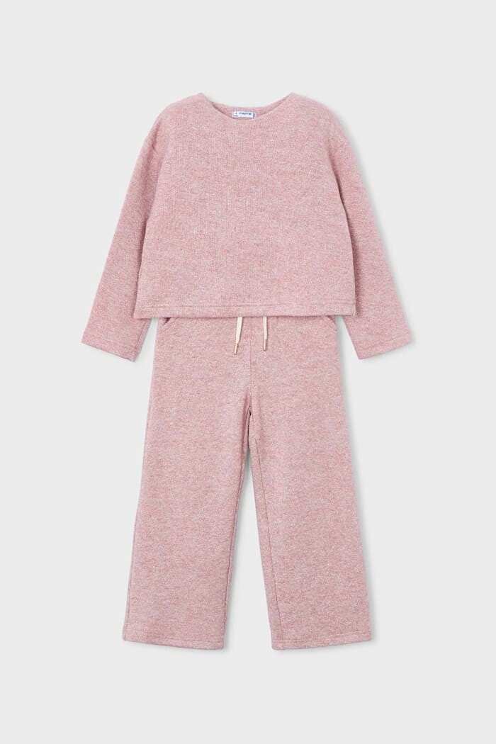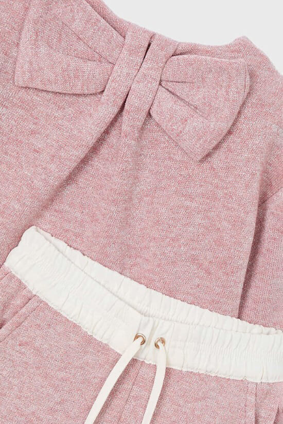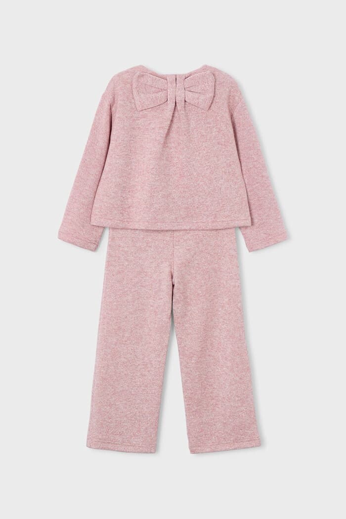 Konforu ve sevimli şıklığı bir araya getiren bu triko takım, yumuşak ve hoş dokulu kumaşıyla çocukların favorisi olacak. Rahat kesimli kazak, sırt kısmındaki büyük fiyonk detayıyla tasarıma eğlenceli bir dokunuş katıyor. Geniş paçalı ve beli bağcıklı lastikli pantolonu ise gün boyu süren oyunlarda ve aktivitelerde maksimum hareket özgürlüğü ve konfor sunar.