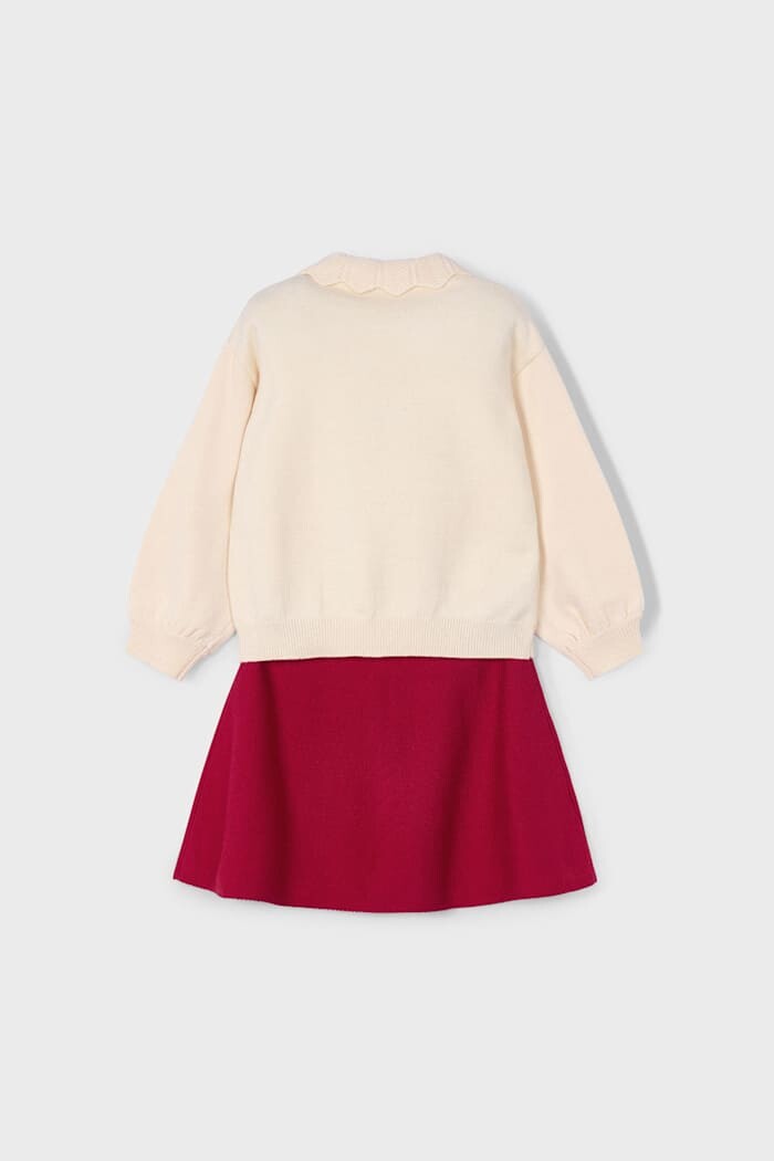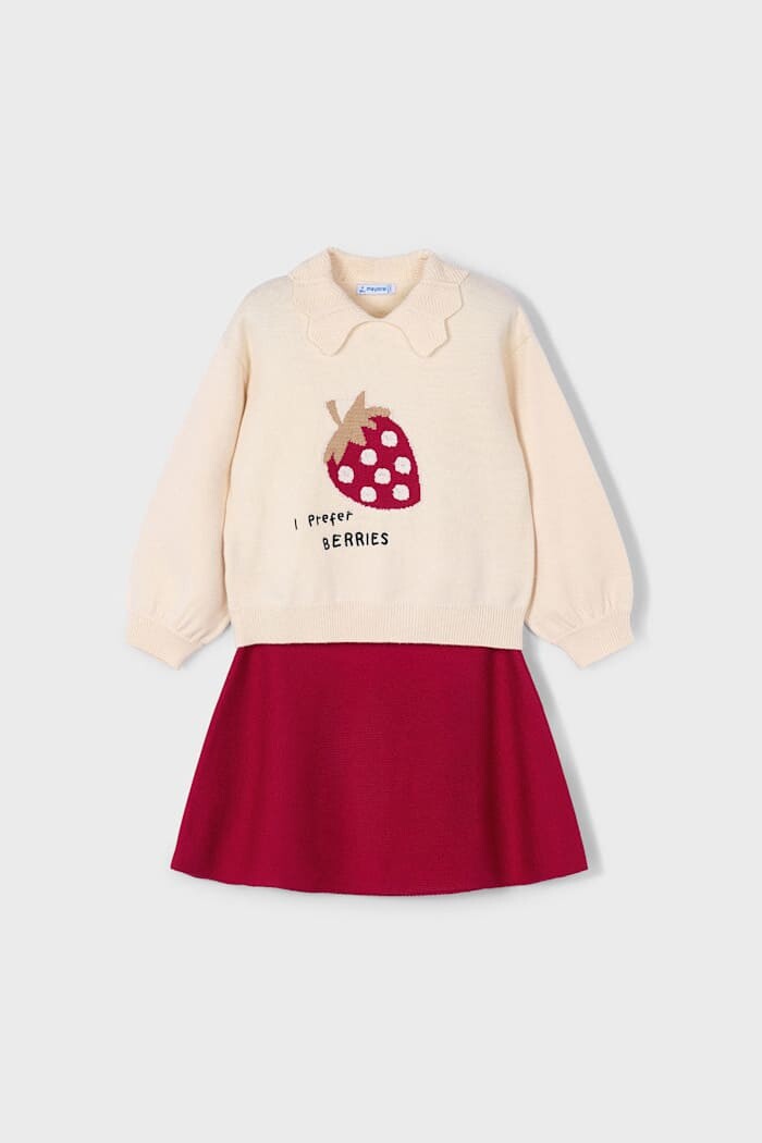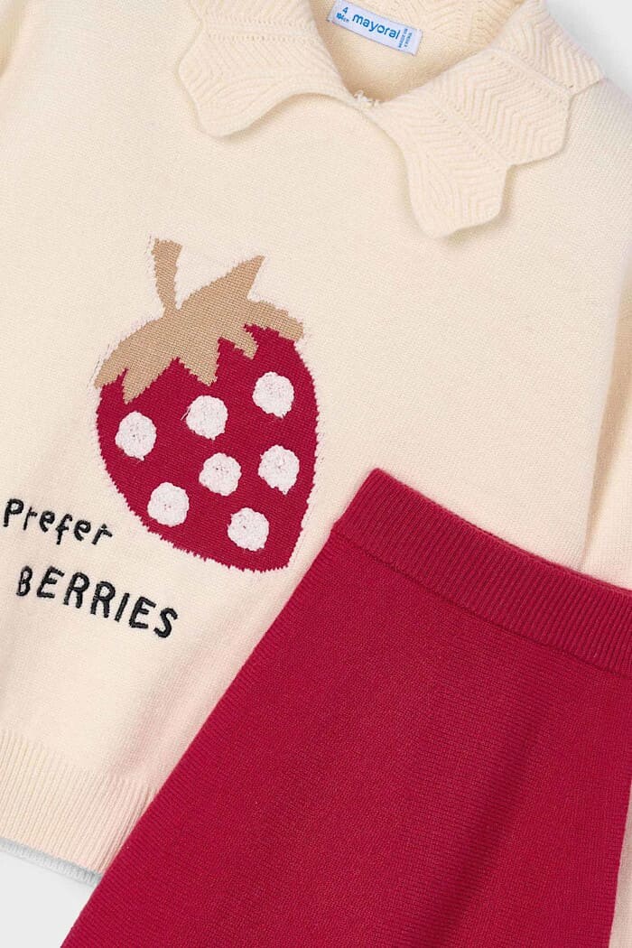 Sevimli ve konforlu bu takım, birbiriyle uyumlu bir kazak ve etekten oluşur. Rahat kesimli kazak, sevimli bir bebe yaka ve intarsia örgü tekniğiyle işlenmiş eğlenceli çilek deseniyle öne çıkar. Konforlu örme kumaştan üretilen beli lastikli etek ise gün boyu hareket özgürlüğü sunar. Geri dönüştürülmüş polyester içeriğiyle sürdürülebilir bir şıklık sunan bu set, çocukların gardırobuna neşe katacak.