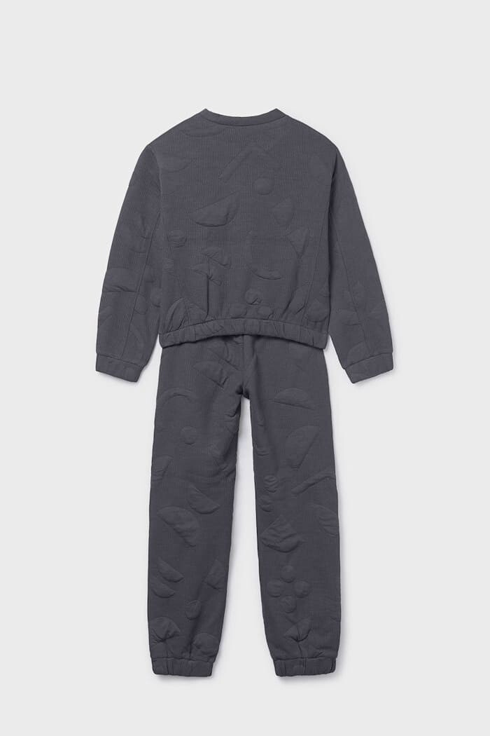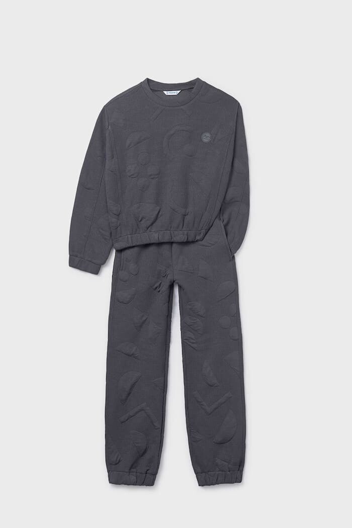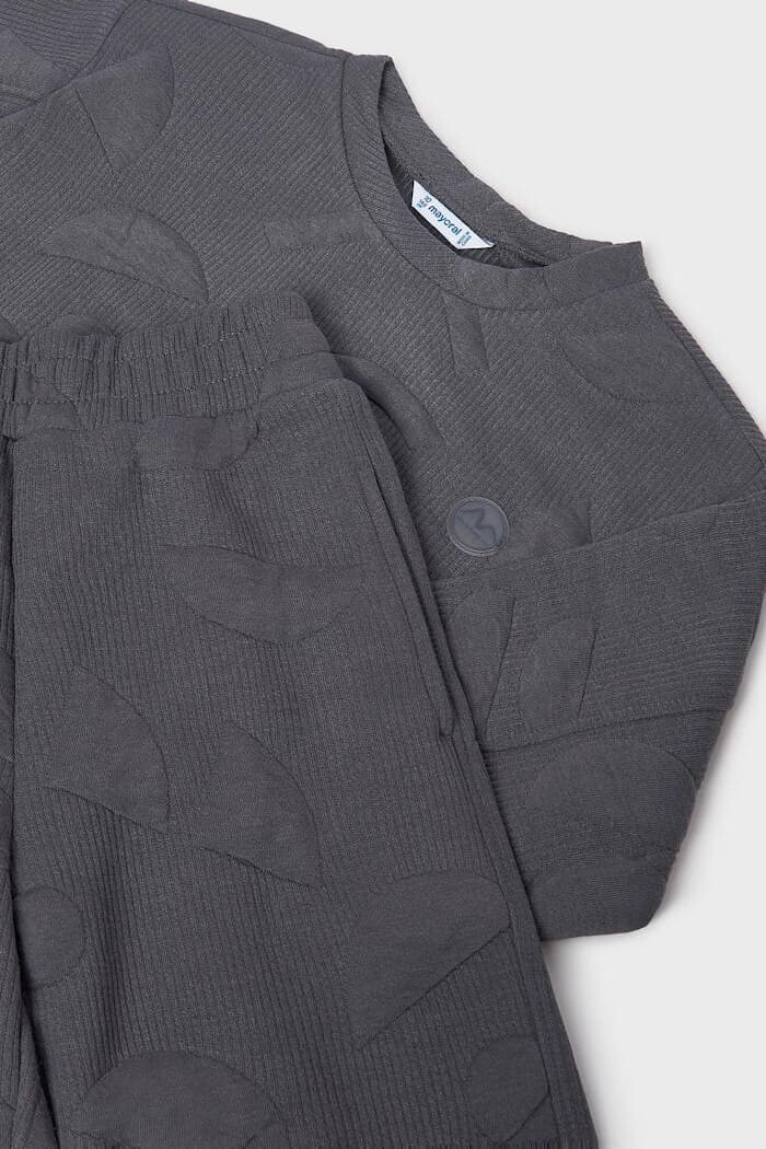 Sade ve modern bir tasarıma sahip olan bu eşofman takımı, özel dokusuyla standartların dışına çıkıyor. Baştan aşağı kabartma geometrik desenlerle süslenmiş kumaşı, takıma üç boyutlu ve sofistike bir hava katar. Yumuşak, esnek ve konforlu yapısı, çocukların hem oyun oynarken hem de dinlenirken rahat etmesini sağlar. Beli lastikli sweatshirt ve jogger pantolonu ile bu takım, konforu ve trend görünümü bir araya getiren zahmetsiz bir şıklık sunar.