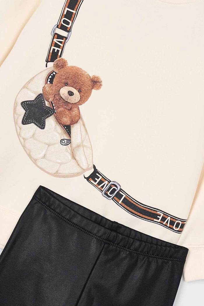Sevimli tasarımı ve konforlu yapısıyla bu takım, çocukların favorisi olacak. Ekru renkli, pamuk karışımlı sweatshirt, üzerindeki sevimli ayıcık ve "LOVE" şeritli çanta baskısıyla eğlenceli bir görünüm sunar. Bu şirin üst, şık ve parlak dokulu siyah tayt ile mükemmel bir kontrast oluşturur. Esnek kumaşları sayesinde gün boyu hareket özgürlüğü sağlayan bu takım, hem okulda hem de oyun zamanlarında çocuğunuzun enerjisine rahatlıkla eşlik edecek.