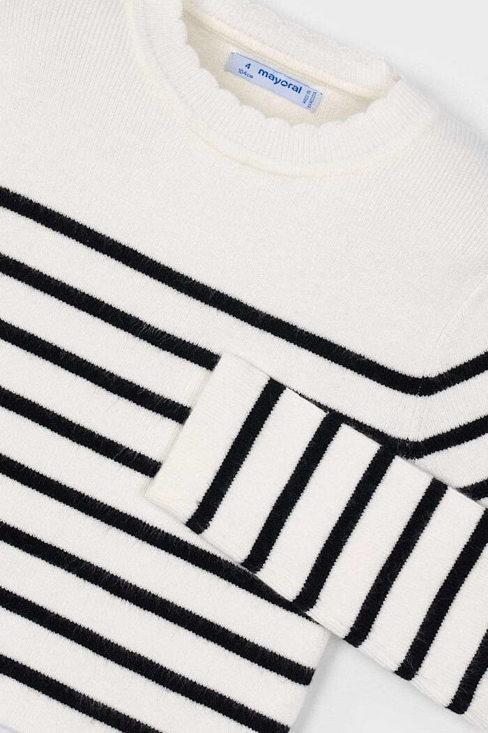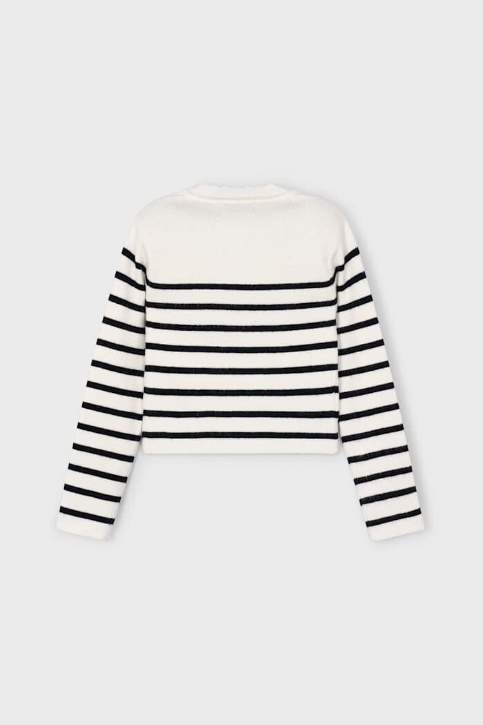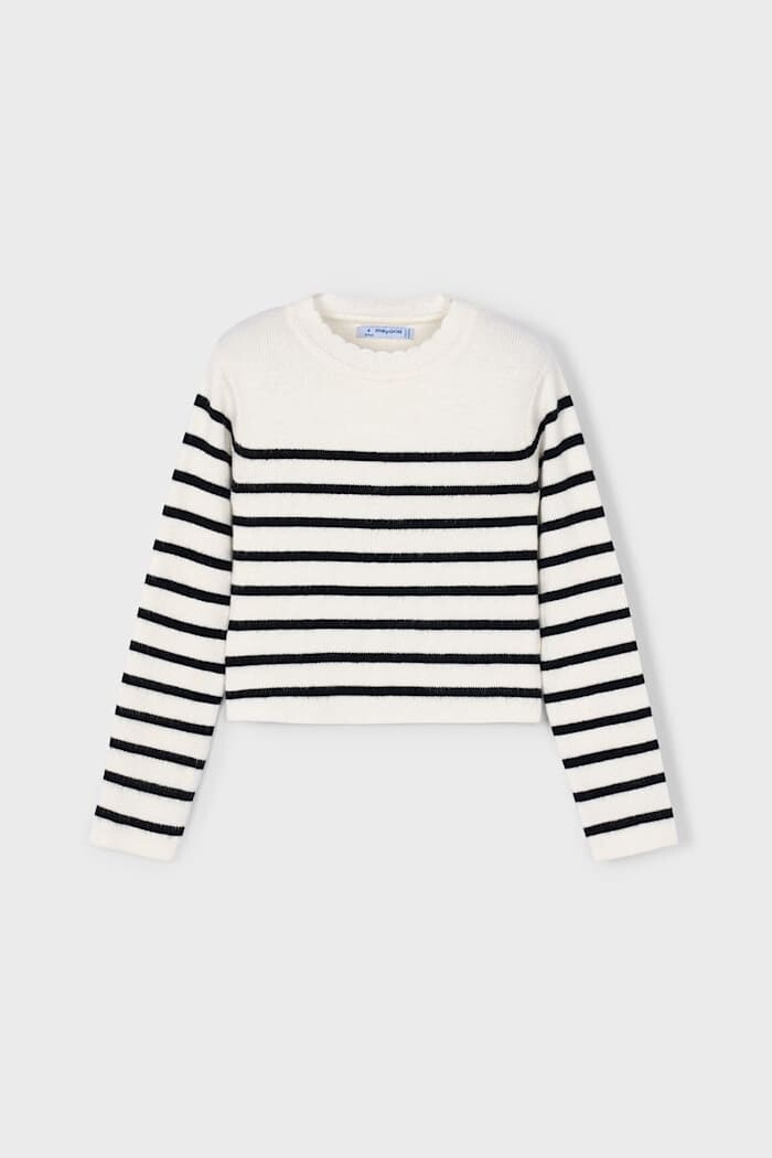 Zamansız Breton çizgilerini modern bir crop kesimle birleştiren bu kazak, çocukların gardırobuna stil katıyor. Viskoz karışımlı, yumuşacık ve hoş dokulu triko kumaşı gün boyu konfor sunar. Hem jean pantolonlarla hem de eteklerle kolayca kombinlenebilen bu parça, her mevsime uygun, şık bir seçenektir.
