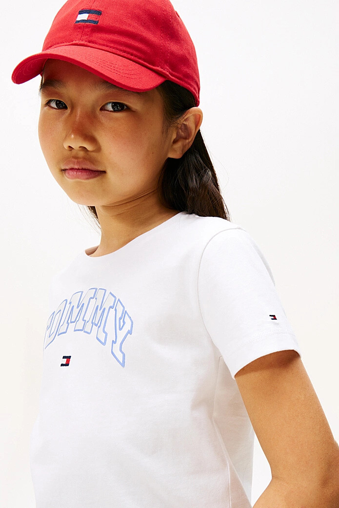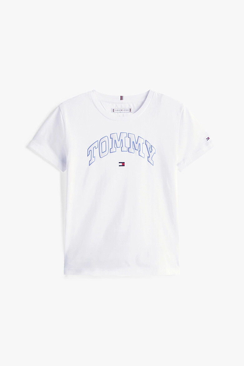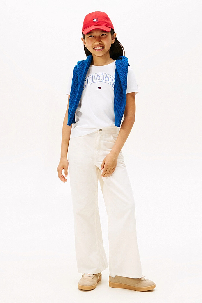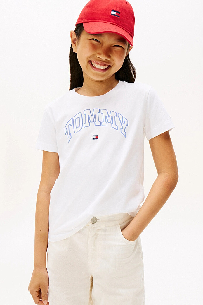 Kolej stilinin enerjisini yansıtan bu tişört, çocukların gardırobuna havalı bir dokunuş katıyor. %100 pamuklu, yumuşak ve nefes alabilen kumaşı, gün boyu konforlu bir kullanım sağlar. Tasarımın odak noktası olan göğüsteki büyük ve kavisli "Tommy" yazısı, parlak saten kumaştan aplike tekniğiyle işlenerek dokulu ve şık bir görünüm yaratır. Günlük kullanım için ideal olan bu tişört, jean'lerden eteklere kadar her parçayla kolayca uyum sağlar.