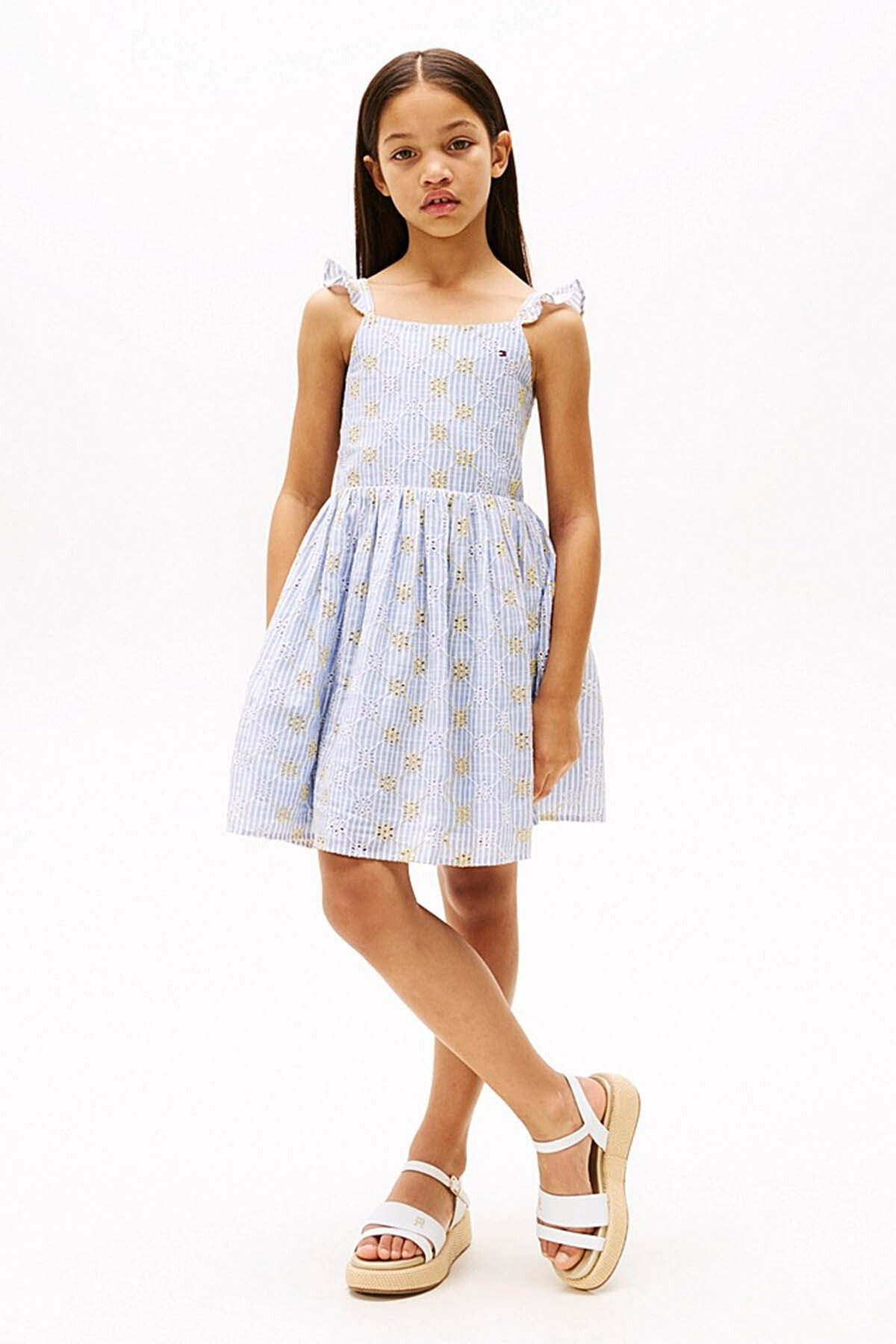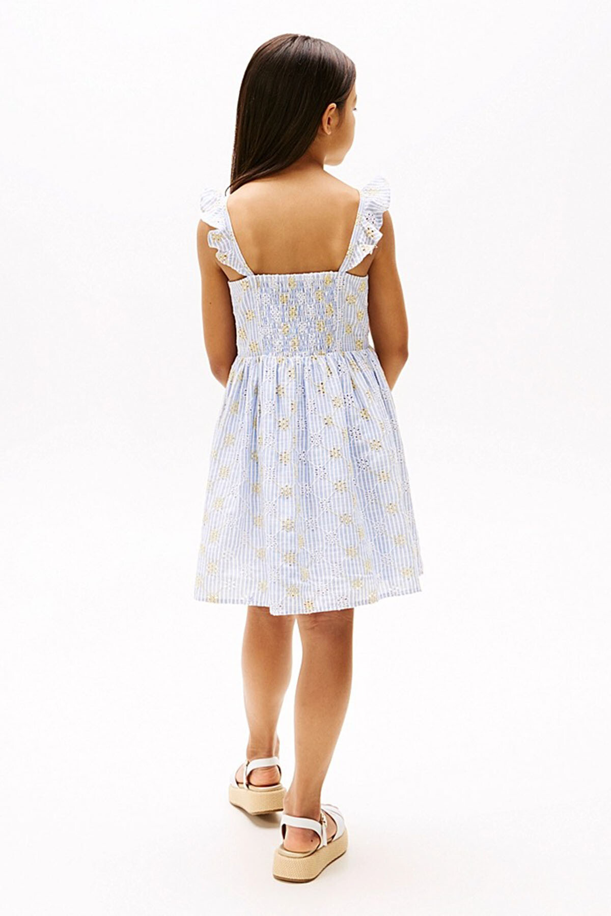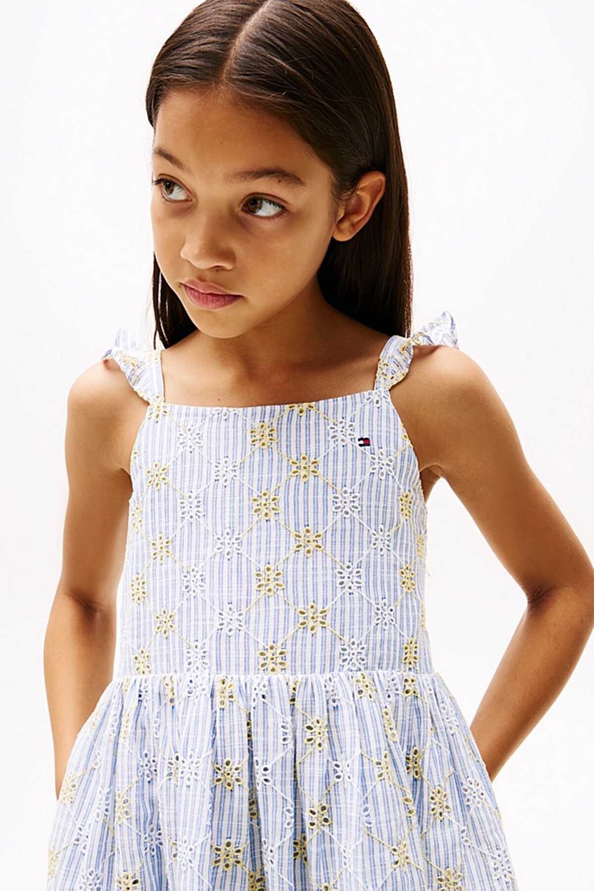 Kız Çocuk Şerit Broderie Anglaise Kolsuz Elbise - Mavi