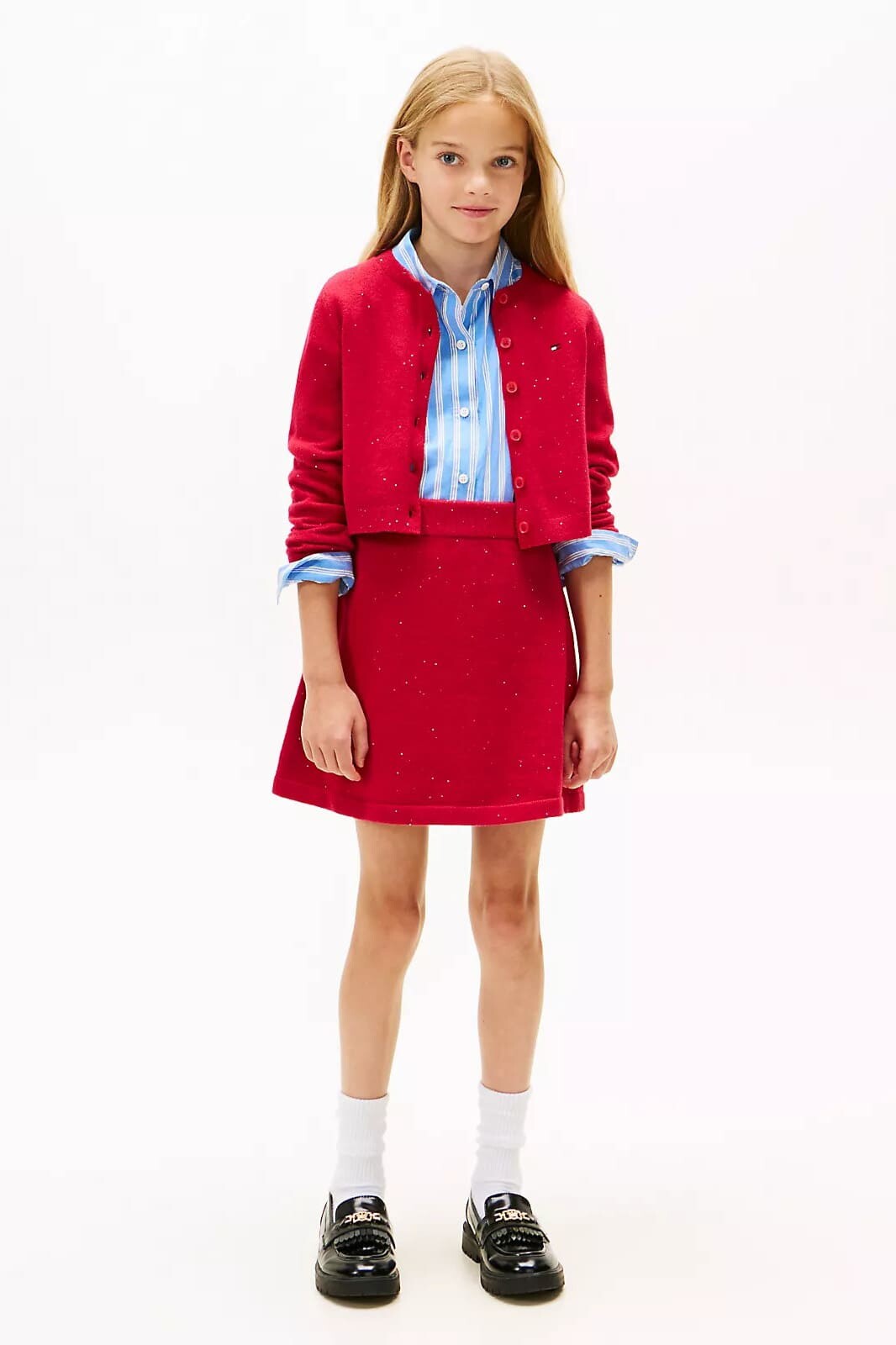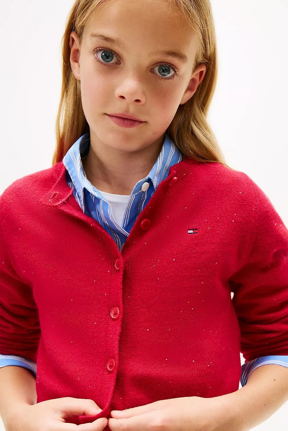 Parti kıyafetlerine ışıltılı bir dokunuş katacak bu hırka ile miniklerin stili parlayacak. Pamuk karışımlı esnek ve fitilli dokusu, içine işlenmiş parıldayan pullarla zenginleştirilerek hem konforlu hem de göz alıcı bir görünüm sunar. Vücudu saran slim fit kalıbı ve klasik bisiklet yaka kesimiyle zarif bir duruş sergileyen bu hırka, önden düğmeli yapısıyla pratik bir kullanım sağlar. Gömleklerin veya elbiselerin üzerine giymek için mükemmel bir katman olan bu parça, özel günlerin vazgeçilmezi olacak.