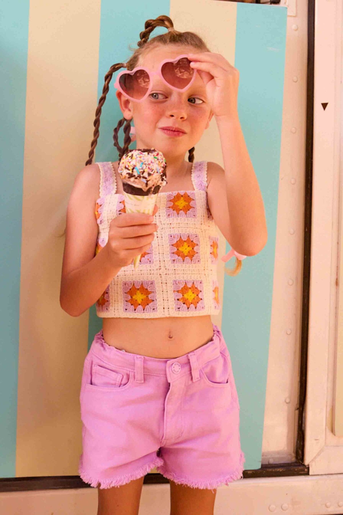 Mayoral koleksiyonuna ait bu temel denim şort, canlı lila rengi ve konforlu yapısıyla kız çocuklarının yaz enerjisine eşlik ediyor. %97 pamuk ve %3 elastan karışımlı esnek kumaş yapısı, hareket özgürlüğünü kısıtlamadan gün boyu yumuşak bir kullanım sunar.