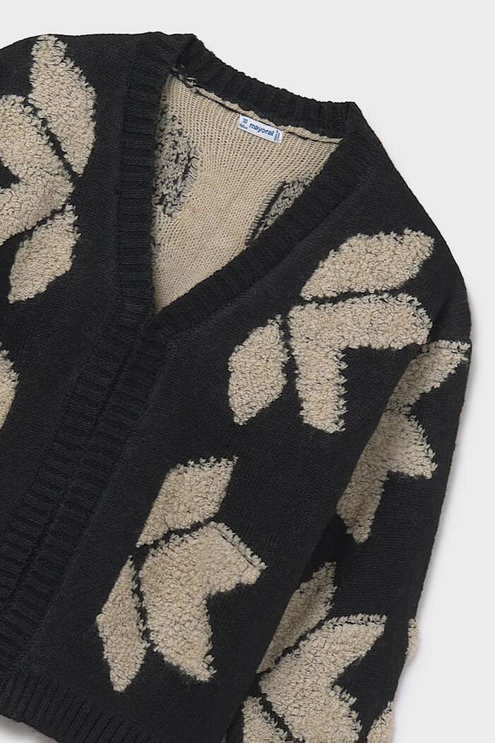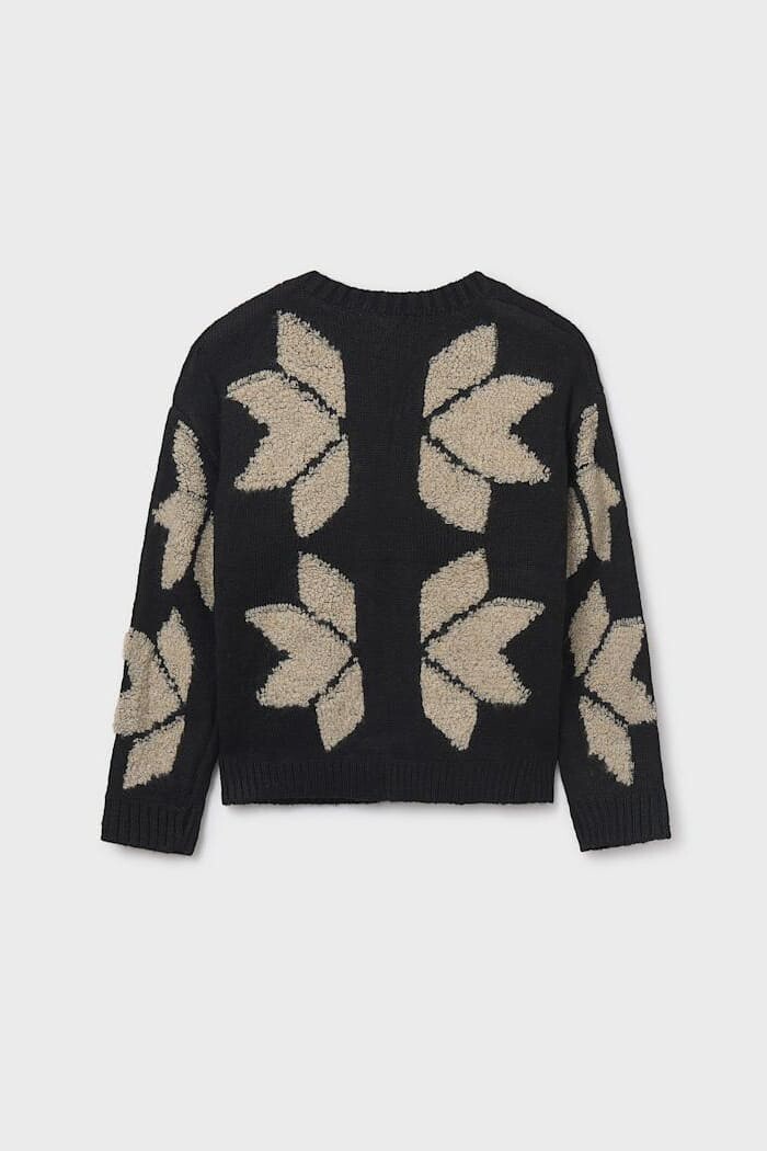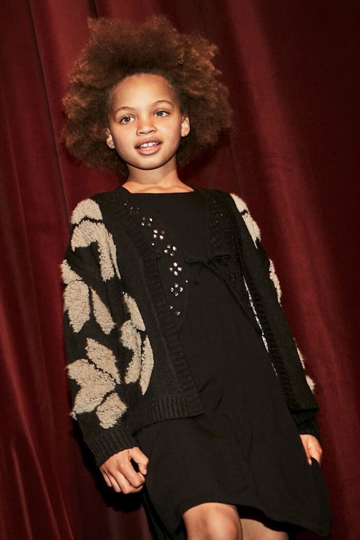 Soğuk günlerde hem sıcak tutacak hem de stil sahibi bir görünüm sunacak bu triko hırka, göz alıcı tasarımıyla öne çıkıyor. Yumuşak ve sıcak tutan yün karışımlı ipliklerle dokunmuştur. Siyah zemin üzerine işlenmiş büyük ve dokulu bej rengi jakar deseni, hırkaya modern ve sanatsal bir hava katar. Klasik V yaka kesimi ve düğmeli önü sayesinde tişörtler, bluzlar ve elbiseler üzerine kolayca giyilebilir. Esnek yapısı ile gün boyu konforlu bir kullanım sunan bu parça, her kombine karakter katacak anahtar bir üründür.