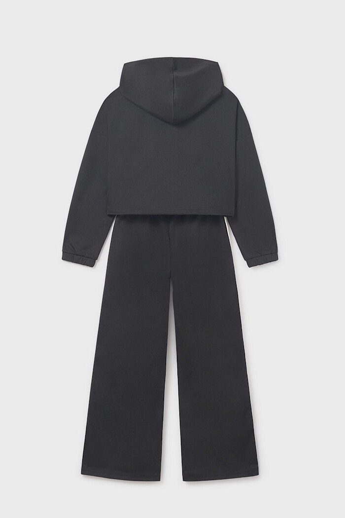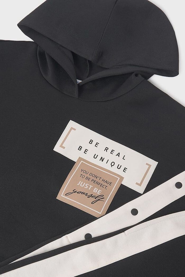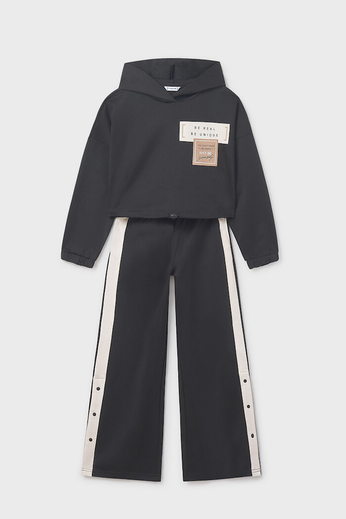 Sokak modasının enerjisini ve konforunu bir araya getiren bu eşofman takımı, çocukların dinamik ruhunu yansıtıyor. Modern crop kesimli kapüşonlu sweatshirt, göğsündeki sloganlı yama detaylarıyla dikkat çekerken, bol paçalı eşofman altı gün boyu rahatlık sunar. Eşofman altının yanlarındaki kontrast renkli şeritler ve baştan aşağı uzanan çıtçıtlar, tasarıma retro ve stil sahibi bir hava katıyor.