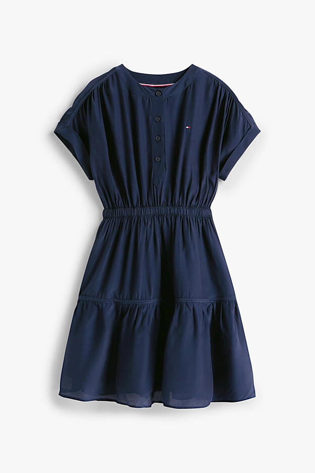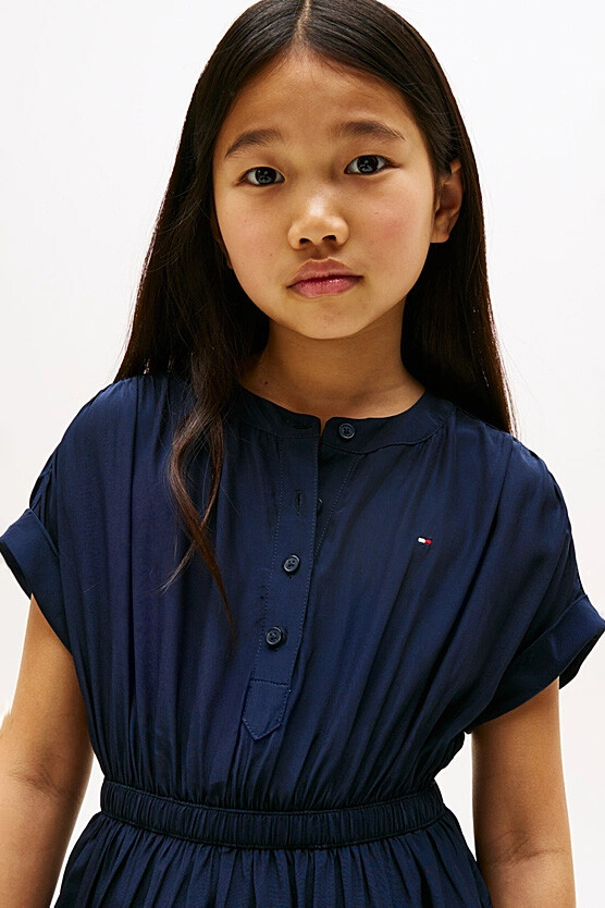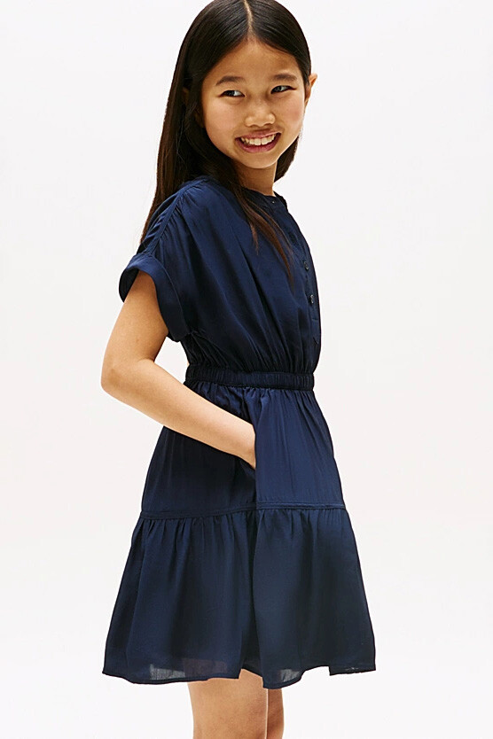 Çocukların neşesine eşlik edecek bu şık elbise, rahatlığı ve zarif detayları bir araya getiriyor. Hafif ve dökümlü %100 viskos kumaşı, astarlı iç yapısıyla gün boyu konforlu bir kullanım sunar. Beli lastikli tasarımı rahat bir oturuş sağlarken, katlı ve hareketli etek ucu elbiseye sevimli bir hava katar. Kısa ve katlamalı kolları ile yarım düğmeli ön patı, klasik ve modern çizgileri birleştirir. Göğüs kısmındaki minimalist nakış logo ise tasarıma zarif bir imza dokunuşu ekler.