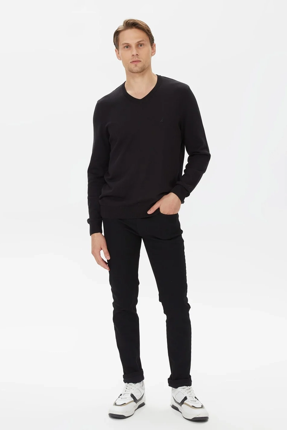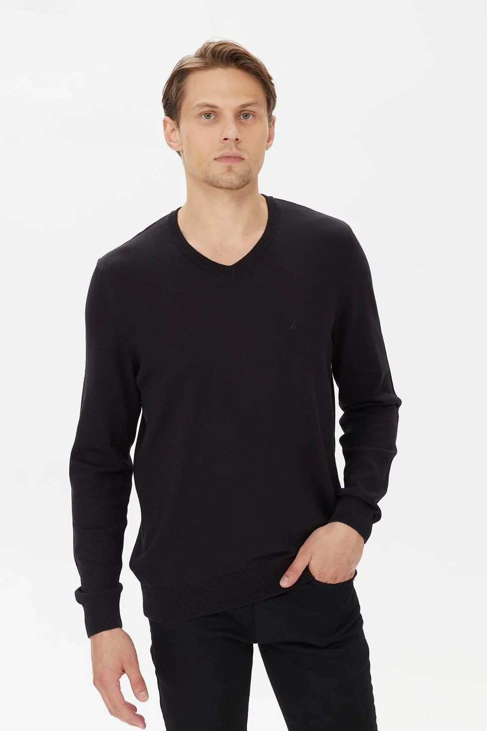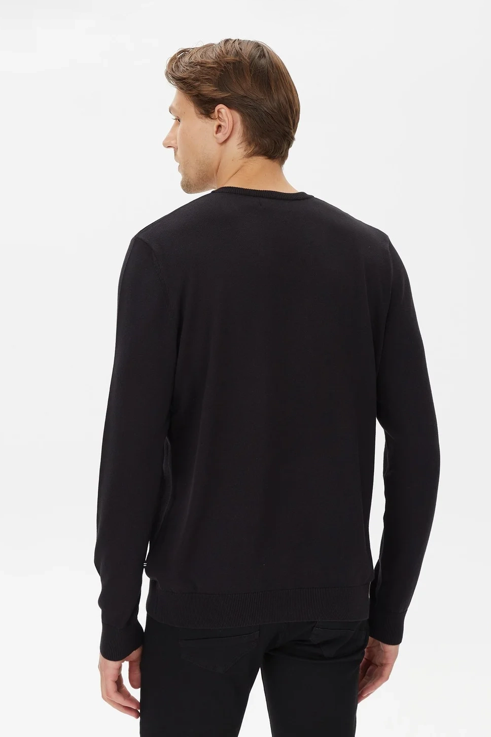 Erkek Standart Fit V Yaka Uzun Kollu Triko - Siyah