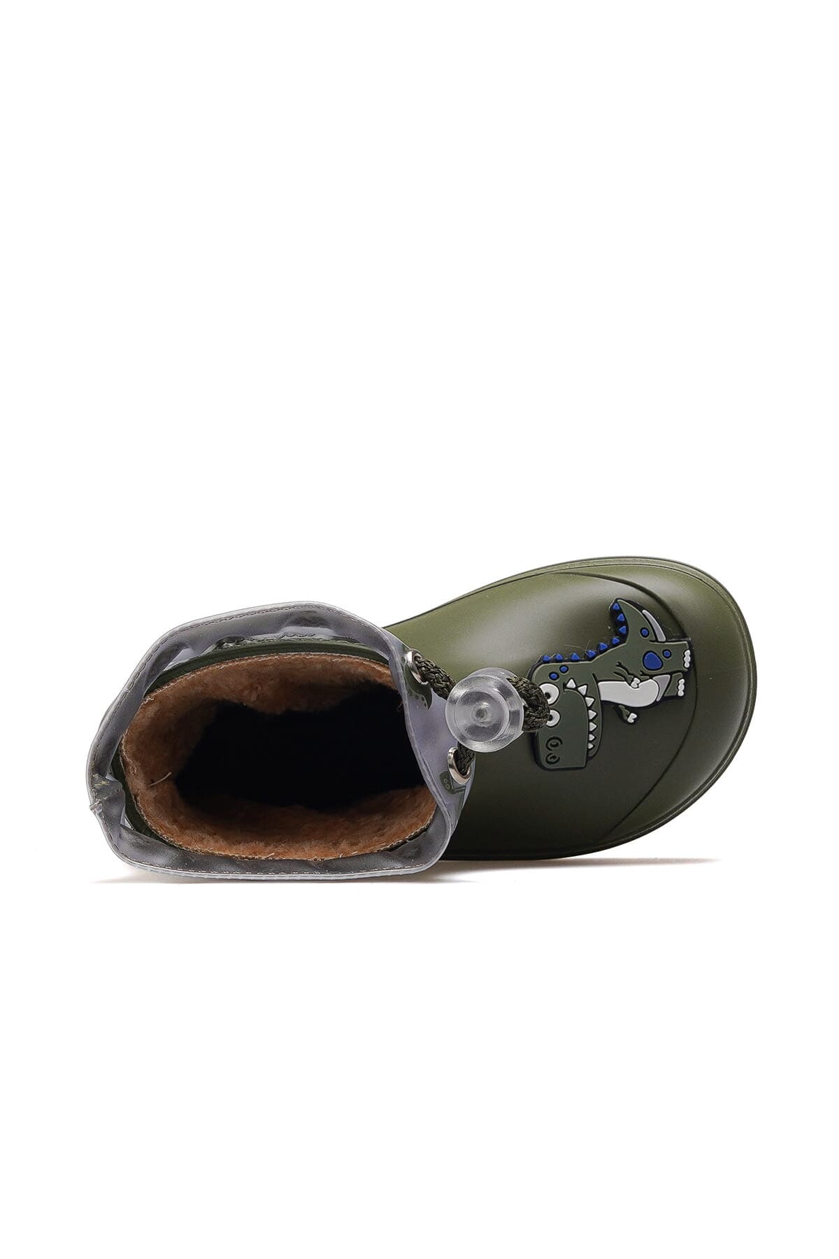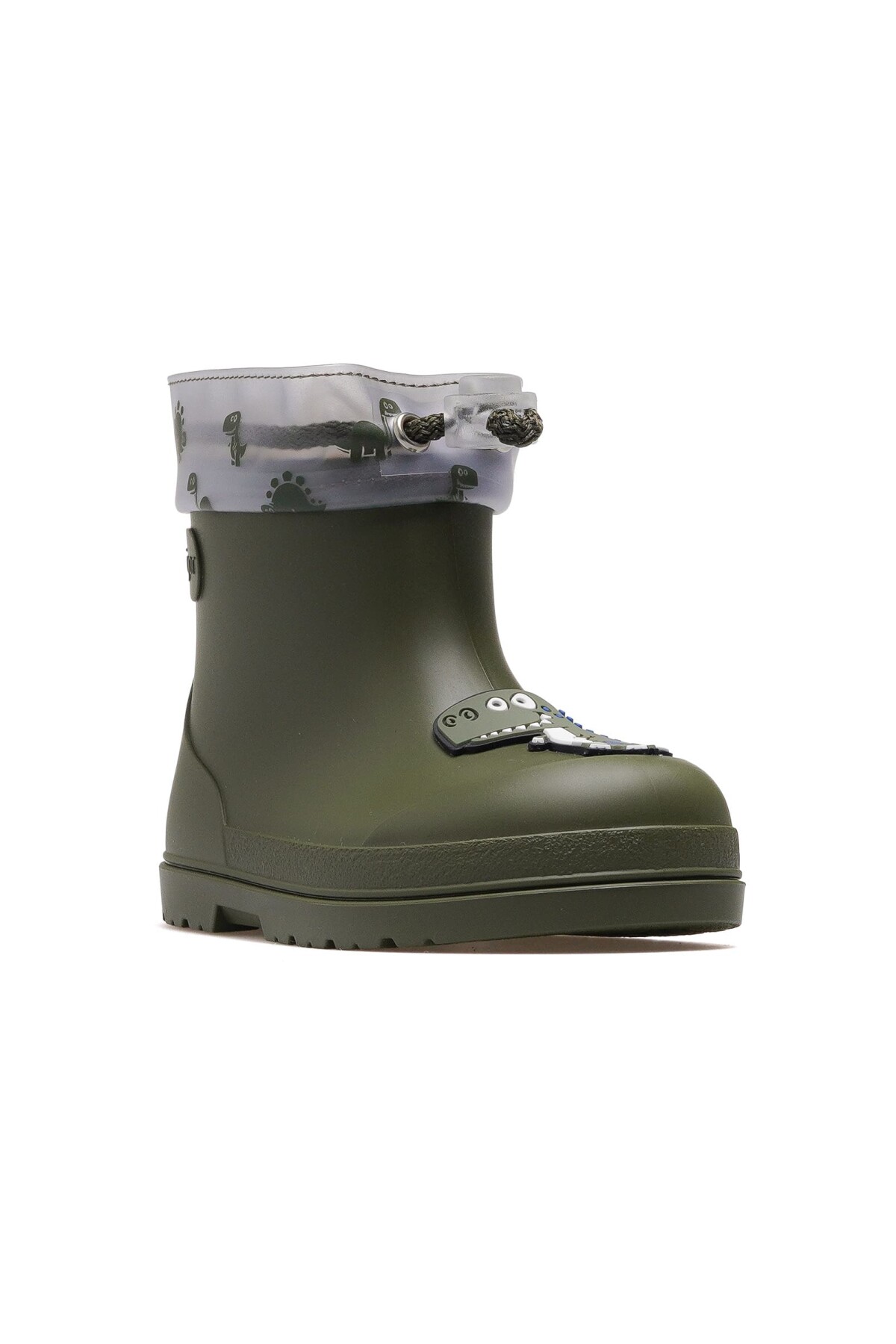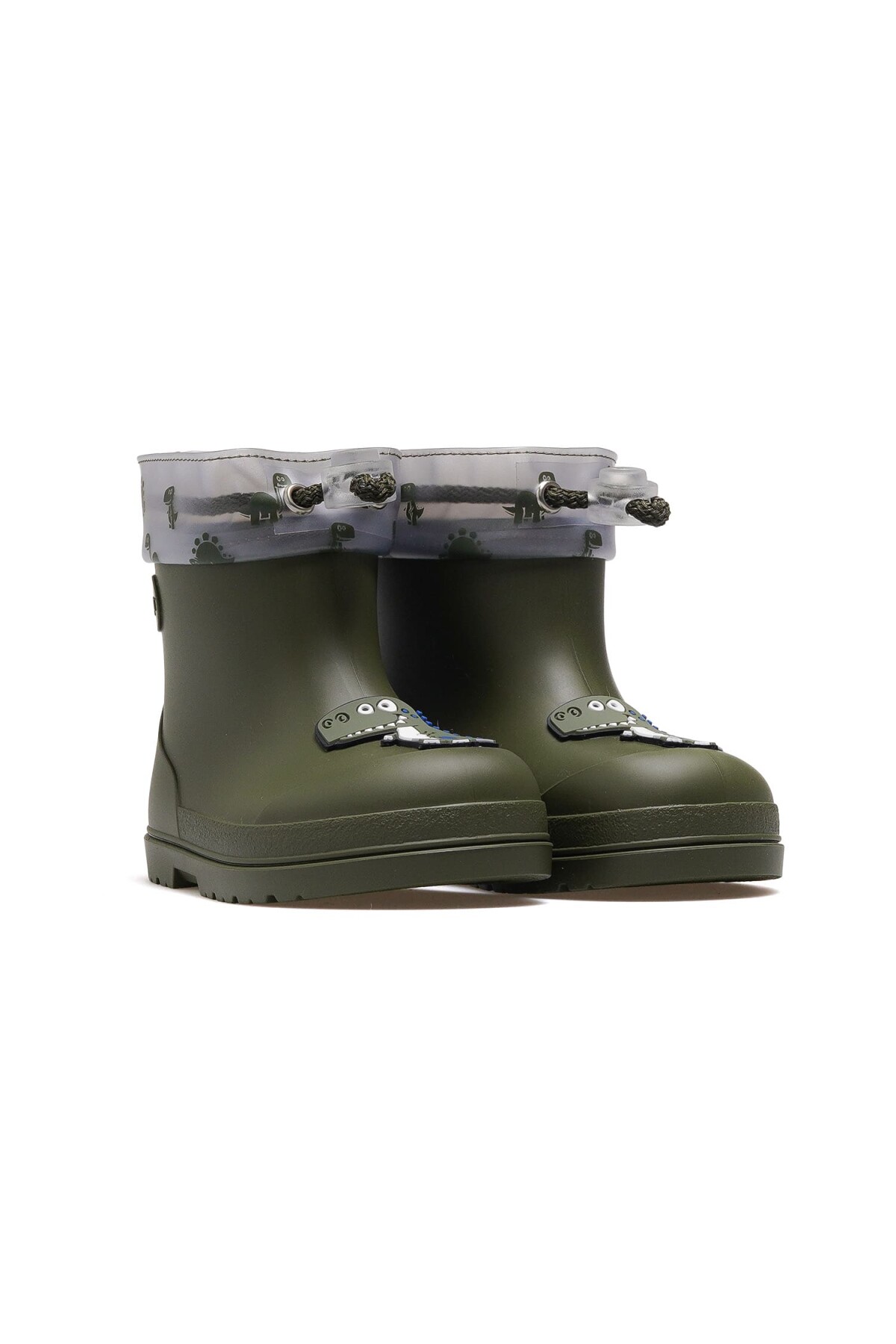 Minik kaşiflerin yağmurlu havalarda keyifle adım atmasını sağlayan bu haki renkli yağmur çizmesi, eğlenceli dinozor figürleriyle dikkat çekiyor. İç kısmındaki yumuşak ve sıcak tutan kürklü astarı (borreguito), soğuk günlerde ayakların üşümesini engellerken konforlu bir kullanım sunar. Konç kısmındaki ayarlanabilir büzgülü bağcık detayı, yağmur suyunun veya karın içeri girmesini önleyerek tam koruma sağlar. Kaymaz taban yapısı ve esnek dış yüzeyi ile çocukların hareket özgürlüğünü kısıtlamadan güvenli oyun saatleri vadeden sevimli bir tasarımdır.